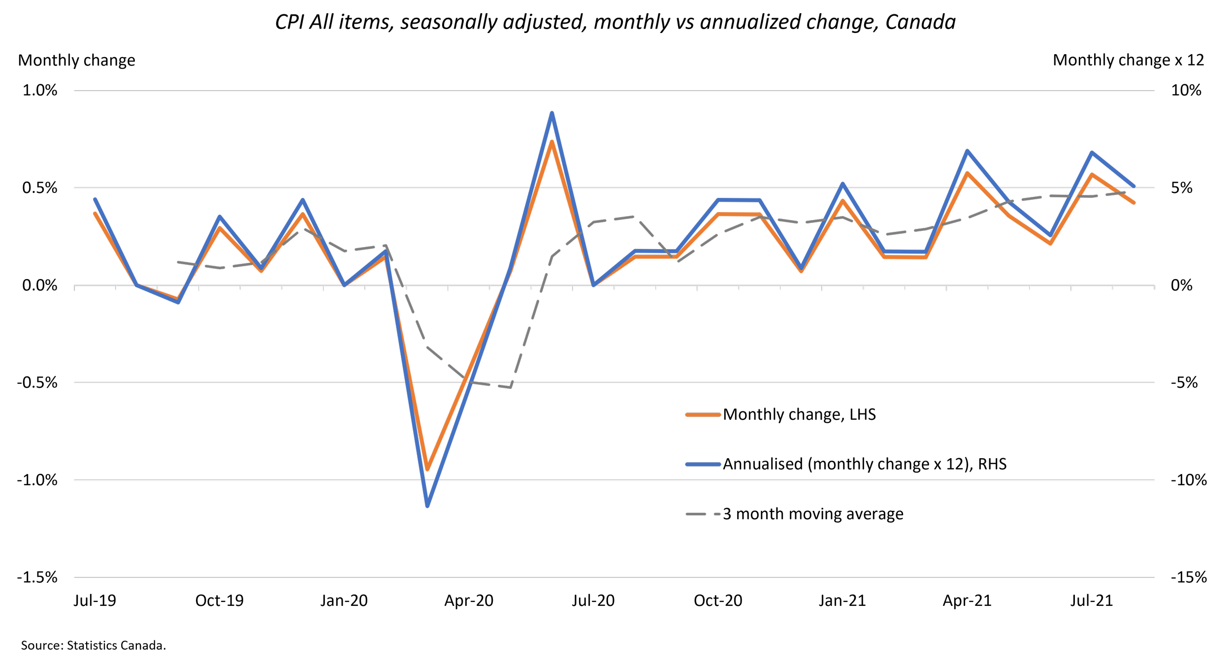 The “base effect” argument has some merit but is increasingly hard to sustain when month-over-month increases for seasonally adjusted total CPI indicate an increasing trend. This translates to an annualized pace (i.e. the monthly change x 12 months) of around 5% (Figure 4), a figure that is eerily similar to the pace of U.S. inflation (more on this below). Part of this may be described as “catch up” in price levels rather than “base effects”. Nonetheless, there are few signs of price momentum easing in the near term. As noted above, price increases are broad-based and showing “a full head of steam”.