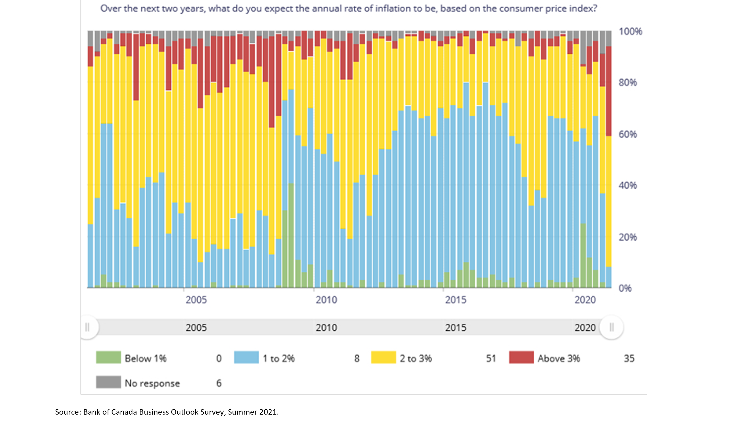 Similarly, most firms expect CPI inflation to remain near the top or above the Bank of Canada’s inflation target range of 1-3% over the next twoyears (Figure 6). These expectations span most of the Bank’s forecasting horizon for monetary policy.