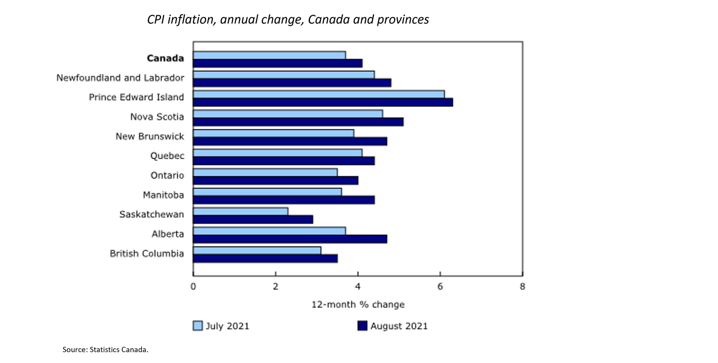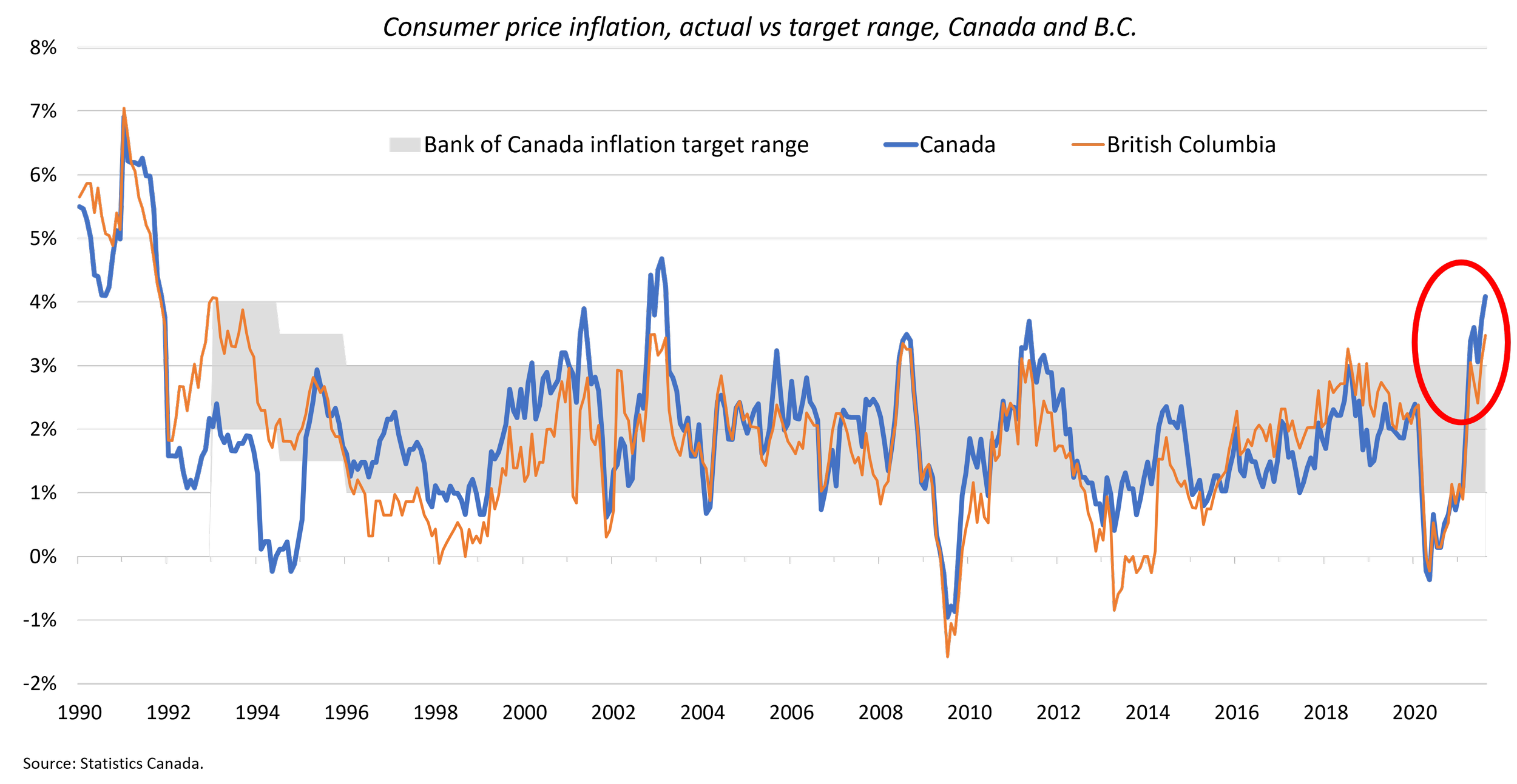 Canadian CPI growth soared to 4.1% year-over-year (y/y) in August 2021, more than double the mid-point of the Bank of Canada’s inflation target range of 2% and well outside its total range of 1-3% (Figure 1). This is the fastest increase in consumer prices since 2003. Rising in seven out of eight major categories, the CPI increase was broad-based across major categories (Figure 2) and also across provinces (Figure 3). For B.C., inflation is 3.5% y/y.