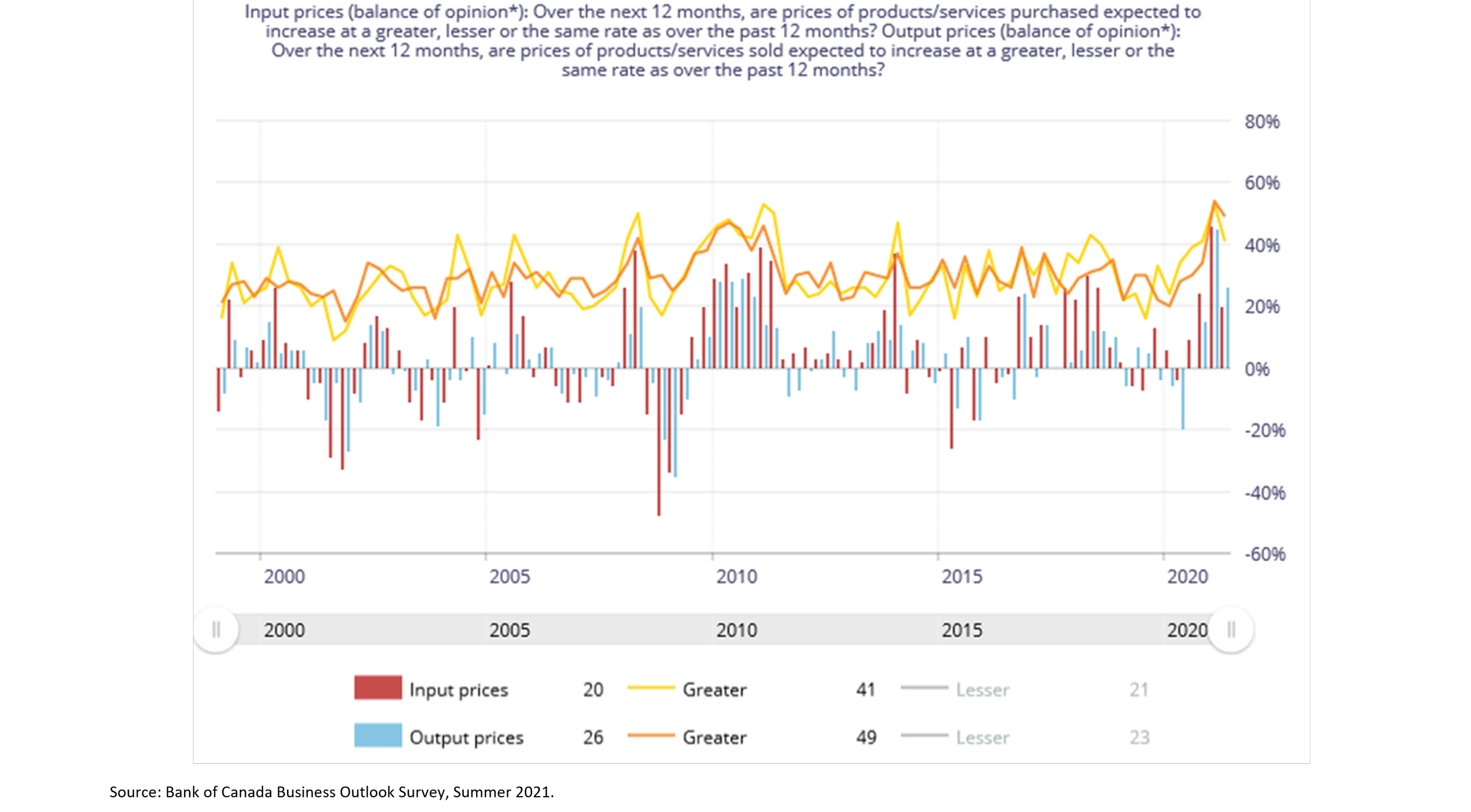 In the Bank’s most recent Business Outlook Survey, half of Canadian firms surveyed expected to raise output prices at a greater rate over the next 12 months than over the past 12 months (Figure 5). The other half of firms were roughly evenly split on planning to increase output prices at the same rate or a lesser rate. Similarly, two-in-five firms expect to see stronger input price pressures over the next 12 months compared to the previous 12 months. Only one-in-five expect less input price pressure and three-in-five firms expect input price pressures to continue at a similar rate. This adds up to a bullish outlook for output and input price growth, at least for the next 12 months.